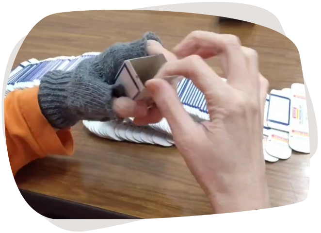 紙再生工房では、さまざまな体の方も安心して作業に取り組めるように、「治具(自助具)」の開発と活用を進めています。